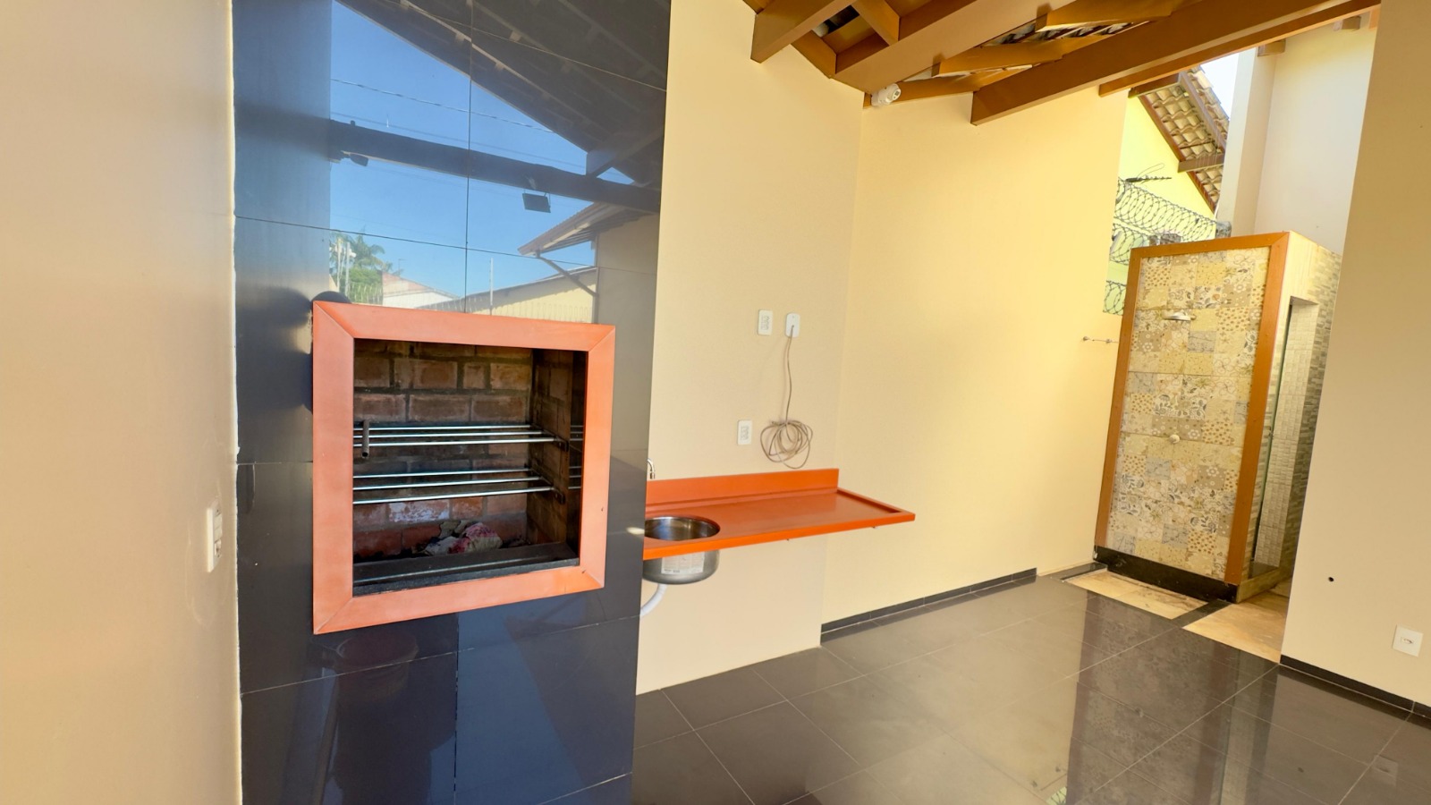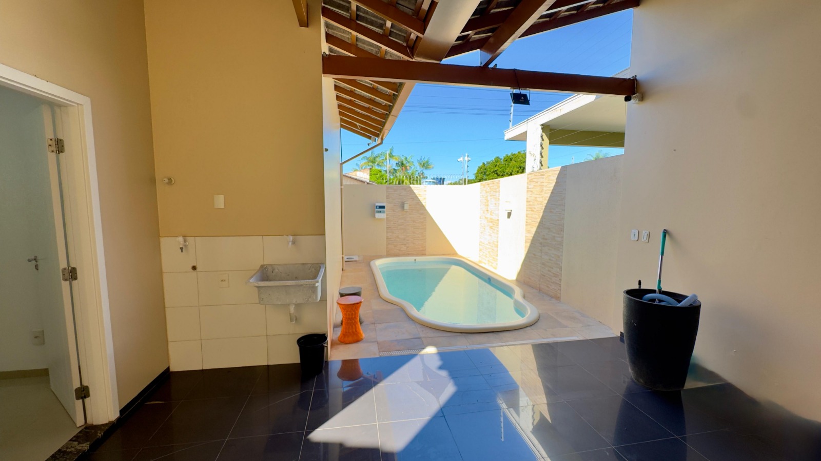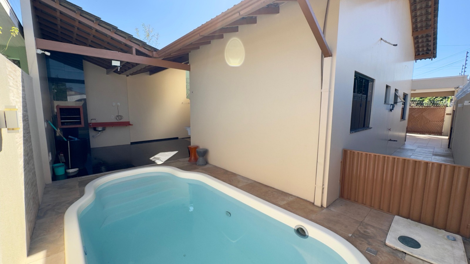 Dependências: ¾ sendo uma suíte, sala de estar, sala de jantar, cozinha, banheiro social, área de serviço, garagem, quintal com edícula, churrasqueira e piscina.